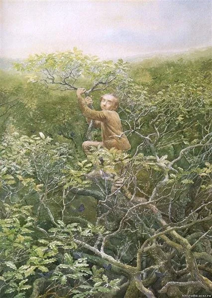 The longer the dwarves and Bilbo wander through the forest, the more the shadow entrances them. They become confused and irritable, straying from the path and turning on one another. In the fog, it is decided Bilbo will climb to the top of one of the trees to get their bearings, else they are eternally trapped in Mirkwood. In the book, Bilbo does so and is initially greeted by fresh air and butterflies, but in his stodgy English way Tolkien determines that Bilbo should not be able to see by the forest because they are, in fact, stuck in a valley. However, in the film adaptation by Peter Jackson, a more positive adjustment is made. Bilbo tastes the clean air, his mind is returned to him, and he sees they are not very far away from their destination at all - the river, the lake, and beyond it - the Lonely Mountain. It is not until the hobbit is able to rise above the bewitchment of the wood that he can see their destination and offer them some direction.